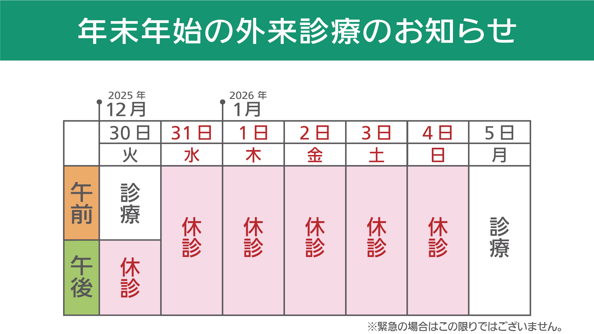 休診日:2025年12月30日(火)午後から2026年1月4日(日)まで
