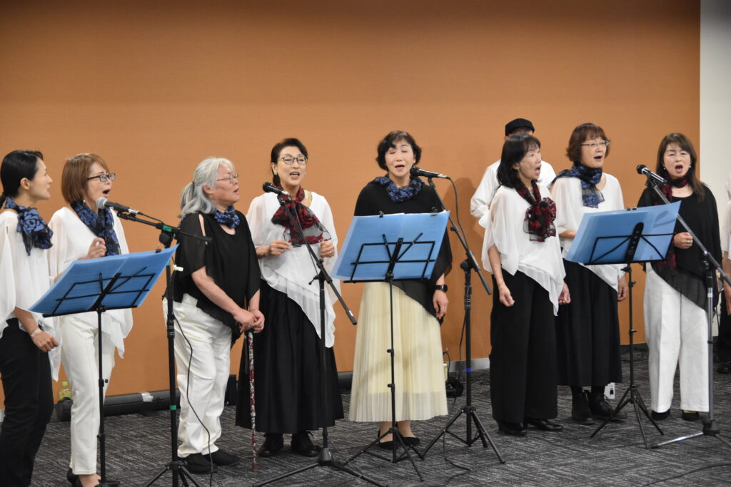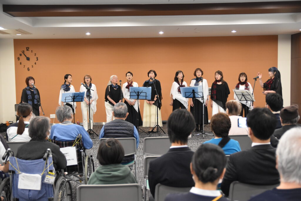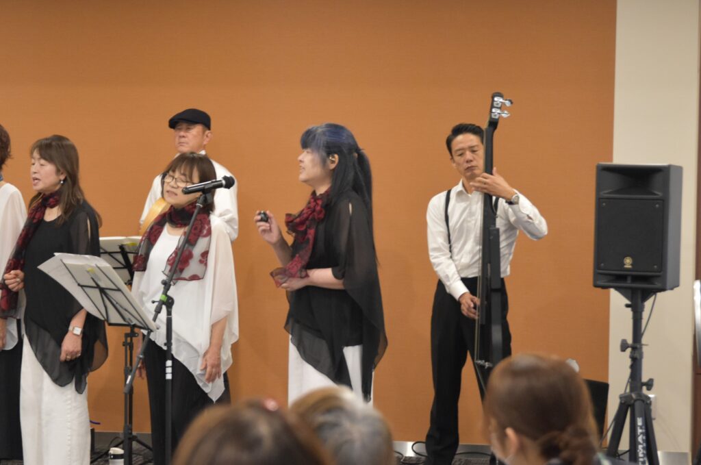 ゴスペルの定番をはじめ「♪ウィスキーがお好きでしょ」など幅広い楽曲を披露していただきました!観覧に来られていた方達は、それぞれの曲が持つ雰囲気を楽しんでいました。今回のステージでは楽器もご用意いただき、そのベースやギターの音色に合わせた深みのある歌唱は、大人ならではの魅力を感じられるひと時でした。