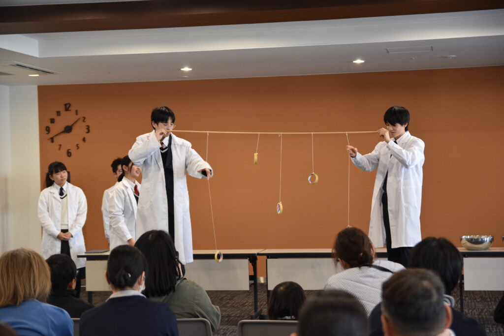 科学の力を利用した、簡単な原理を活かしたものから大がかりな作成物を使ったものなど、多種多様な実験SHOW。目の前で起こる不思議な現象に、ホールではたくさんの驚きの声が響いていました。司会や実験の解説も全て高校生が行い、会場の皆さんは驚きと納得の時間を楽しんでいました!
